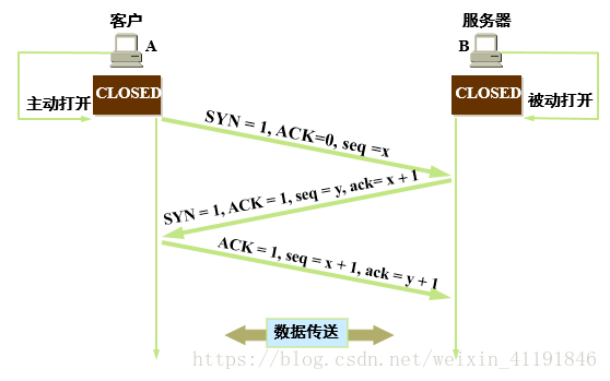 • 第一次握手:客户端发送 syn (Synchronization:同步) 包 (syn=j) 到服务器,并进入SYN_SEND 状态,等待服务器确认