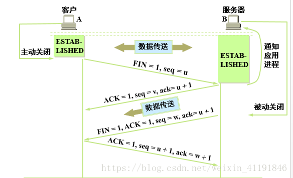 • 第三次挥手:当B向A发完所有数据后,向A发送连接释放请求,请求头:FIN=1,ACK=1,seq=w,ack=u+1。