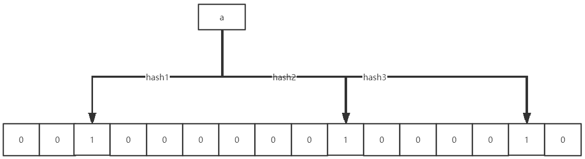 当添加一个数据时,我们通过 k 个散列函数,将数据散列到 bit 中,并将分配到的 bit 置为 1 。例如传入一个数据a,并且通过三个不同的 hash 函数计算 a 的散列值: