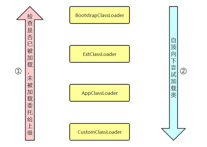 双亲委派 当某个类加载器要加载某个类时,它会先将加载任务委托给父类加载器,一直递归到顶层,如果父加载器没有加载这个类,自己才会尝试加载这个类。