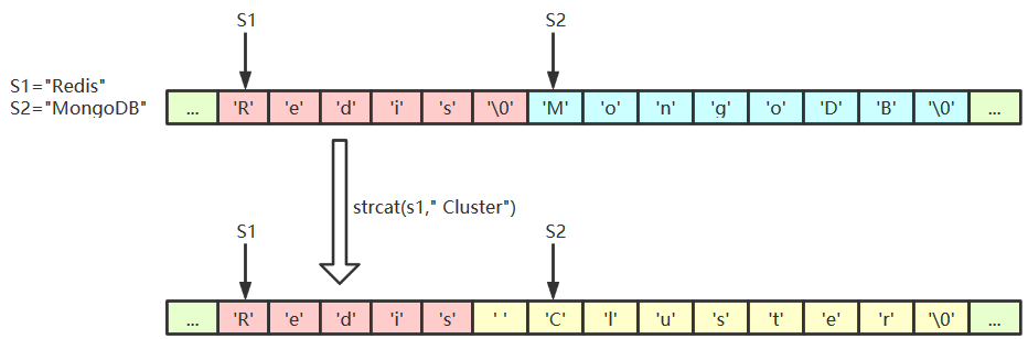 假设有两个字符串 S1="Redis" 和字符串 S2="MongoDB",并且S1和S2在内存中的地址是相邻的