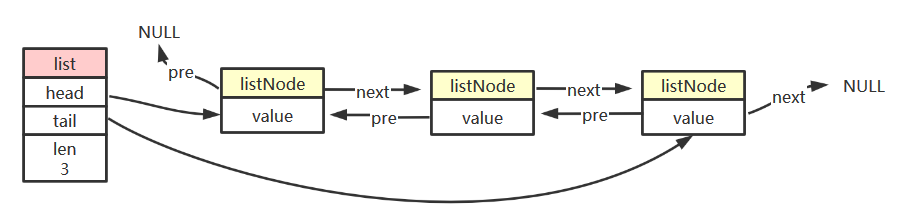 多个这样的 listNode 节点形成一个双向链表,并且在Redis中使用了 list 结构来管理这个双向两边,使得操作更加方便